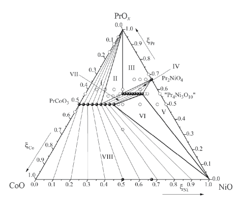 Никелаты редкоземельных элементов с перовскитоподобной структурой являются перспективными материалами для использования в качестве катодов в топливных элементах [1–13]. В отличие от оксидных систем на основе других 3d-переходных металлов (например, Co, Fe, Mn), никелаты РЗЭ, образующиеся в Ni-содержащих системах и относящиеся к гомологическому ряду Раддлесдена–Поппера Lnn+1NinO3n+1, могут быть получены на воздухе без введения в А-подрешетку заместителей акцепторного типа (например, катионов щелочноземельных металлов). Особое внимание среди других редкоземельных элементов привлекает празеодим, так как проявляет высокую каталитическую активность в окислительно-восстановительных реакциях с участием кислорода. Частичное замещение никеля на кобальт в В-подрешетке приводит к повышению стабильности оксидов со структурой перовскита АВО3, а также к увеличению электропроводности, электрохимической активности оксидов, и ускорению процессов обмена кислородом между твердой и газовой фазами [14–25]. Однако, имеющаяся информация о выборочных составах при совместном присутствии никеля и кобальта в образующихся оксидах с перовскитоподобной структурой не дает полной картины о фазовых равновесиях в системе PrOx – NiO – CoOx. Еще одним важным параметром, ответственным за многие функциональные свойства, является содержание кислорода в оксидах. Имеющаяся информация, о содержании кислорода в оксидах в вышеупомянутой системе недостаточна. Таким образом, целью настоящей работы является установление фазовых равновесий в системе PrOx – NiO – CoO при 1373 К на воздухе и определение содержания кислорода в образующихся фазах.