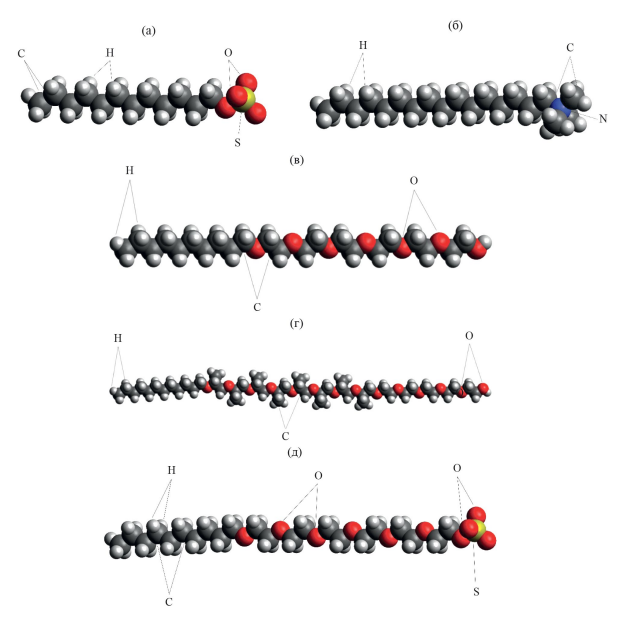Рис. 1. Полноатомные модели поверхностно-активных веществ и ионов: додецилсульфат анион C12H25OSO3– (а), катион цетилтриметиламмония C16H33N+(CH3)3 (б), дециловый эфир гексаэтиленгликоля C10E6 (в), молекула C12P8E5 (г), анион C10E6SO4– (д).