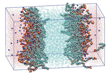 Рис. 2. Ячейка моделирования, содержащая 170 молекул C10E6SO4Na, 700 молекул декана и 10000 молекул воды. Ось Z перпендикулярна обоим монослоям ПАВ.