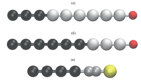 Рис. 3. Грубозернистые модели поверхностно-активных веществ и ионов, использованные в расчетах: (а) монодециловый эфир гексаэтиленгликоля C10E6, (б) монононадециловый эфир триэтиленгликоля C19E3 и (в) додецилбензолсульфонат анион ДБС. Грубозернистые силовые центры {CH3 – (CH2)2 –} и {– (CH2)3 –} изображены черными шарами, бензольное кольцо – двумя близко расположенными серыми шарами, силовые центры {– CH2 – O – CH2 –}, {– OH} и {– SO3–} – белыми, красными и желтыми шарами соответственно.
