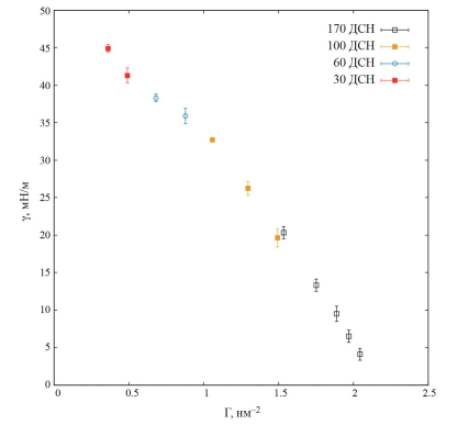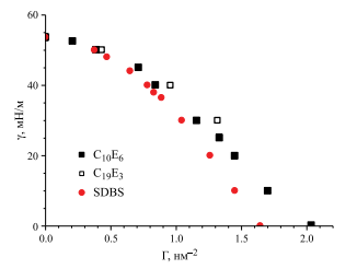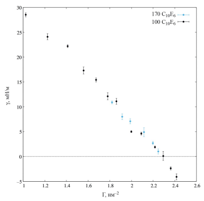 С увеличением адсорбции ПАВ межфазное натяжение γ, вычисленное на основе механического определения, см. формулу (1), уменьшается, и при значениях адсорбции больше 0.9 нм–2 γ уменьшается линейно с ростом адсорбции, достигая отрицательных значений при адсорбциях выше 2.05 нм–2.