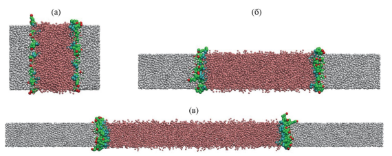 Далее следовало уравновешивание системы в NPT-ансамбле. На этой стадии средний объем системы принимал значение, характерное для заданного давления (для этого обычно было достаточно несколько сотен пикосекунд), затем в течение нескольких десятков наносекунд все молекулы ПАВ уходили на границу раздела углеводород – вода.