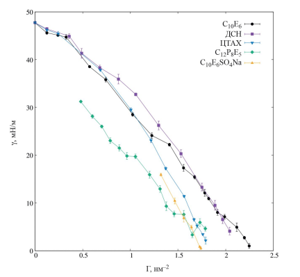 Графики зависимости МФН от адсорбции для пяти различных ПАВ представлены на рис. 7. В качестве анионных ПАВ были выбраны додецилсульфат натрия и C10E6SO4Na, в качестве катионного – хлорид цетилтриметиламмония, также были рассмотрены два неионных ПАВ – C10E6 и C12P8E5. Для всех ПАВ, кроме C12P8E5 и C10E6SO4Na, графики МФН были построены во всем диапазоне адсорбций. Состав моделируемых систем приведен в Таблице. На основании полученных зависимостей МФН от адсорбции можно сделать вывод, что C10E6SO4Na позволяет достичь в данной системе наименьшее значение МФН среди пяти рассмотренных одиночных ПАВ.