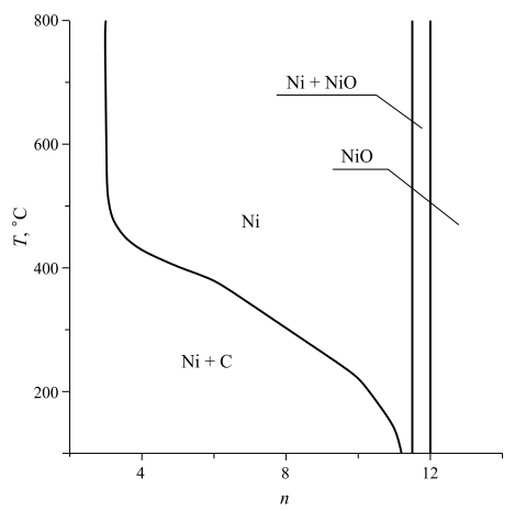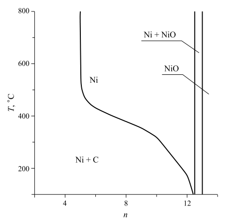 Как видно из рис. 1, в результате процесса CVD в данной системе может быть получено два фазовых комплекса: Ni + C и NiO + Ni, а также никель и его оксид. Тенденцию изменения фазового состава пленки, а также содержания и парциального давления молекулярных газовой фазы от температуры при n = 8 и давлении 0.1 Торр можно видеть в таблице 1.
