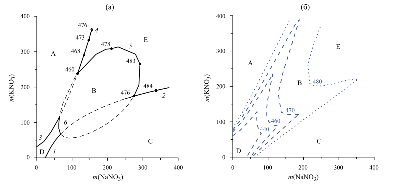 Рис. 3. Результаты расчета составов насыщенных растворов в системе NaNO3–KNO3–H2O при давлении пара PH2O = 1 бар, сплошные линии (а), при давлении насыщенного пара и температурах 440, 460, 470, 480 K (пунктирные линии (б)). Линии (а) соответствуют равновесию насыщенного раствора с солью NaNO3 (1, 2), с KNO3 (3, 4), с NaNO3·KNO3 (5, 6). Буквами A, B, C обозначены области сосуществования насыщенного раствора с паром при давлении PH2O > 1 бар, буквы D, E соответствуют равновесиям с давлением PH2O < 1 бар.