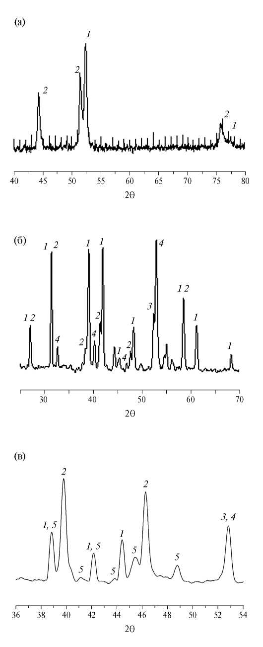 Рис. 1. Фрагменты рентгенограмм композитов: a – VN (1 – VN, 2 – α-Fe); б – CrN-AlN (1– AlN, 2 – CrN, 3 – (CrFe)2n-х 4 – α-Fe); в – AlN-SiN-ZrN (1– AlN, 2 – ZrN, 3 – α-Fe, 4 – FeSi, 5 – Si3N4).