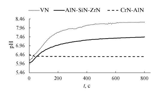 На рис. 2 представлены кинетические кривые исследуемых композитов. Видно, что для композитов VN и AlN-SiN-ZrN характерно плавное изменение рН в слабоосновную область, что указывает на присутствие уже гидроксилированных бренстедовских центров и слабоосновное состояние поверхности. Кислотность суспензии композита CrN-AlN не изменяется во времени и близка к рН деионизованной воды. Это может быть следствием того, что соотношение кислотных и основных центров на поверхности данного композита аналогично рН воды (соотношению концентраций водородных и гидроксильных ионов). При этом динамические процессы обмена в системе практически не приводят к изменению рН суспензии.