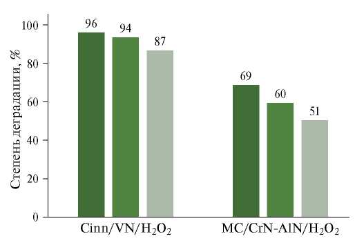 Рис. 6. Степень деградации циннаризина и метиленового синего в присутствии композитов VN и CrN-AlN в трех повторных циклах.