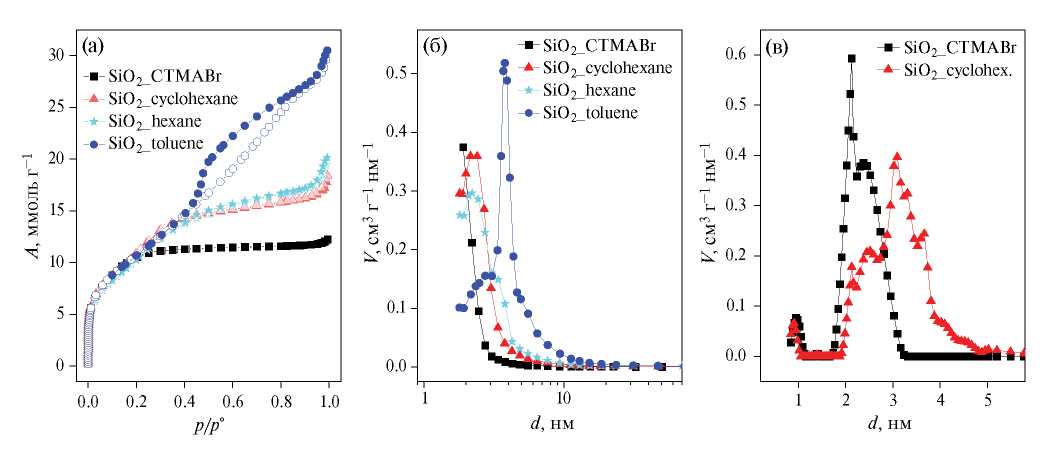 Изотермы адсорбции-десорбции азота также заметно отличаются друг от друга. Для образца, полученного с использованием толуола, наблюдается выраженный гистерезис, что свидетельствует о его мезопористости. Для остальных образцов гистерезис на изотермах не наблюдается. Распределение пор по размерам также неодинаковы, образец, полученный с использованием толуола в качестве расширителя пор, демонстрирует максимум распределения при больших значениях диаметров – порядка 4 нм, в то время как остальные образцы имеют максимумы распределения пор по диаметрам в области порядка 2–3 нм. Образец, полученный без расширителя, и образец, полученный с циклогексаном в качестве расширителя, демонстрируют, помимо узких мезопор, еще и микропоры с максимумом при ∼1 нм, что может быть объяснено тем, что помимо мицелл поверхностно-активного вещества, в растворе всегда присутствует в равновесии и его молекулярная форма в концентрации на уровне критической концентрации мицеллообразования (для CTMABr ∼1 мМ [27]).