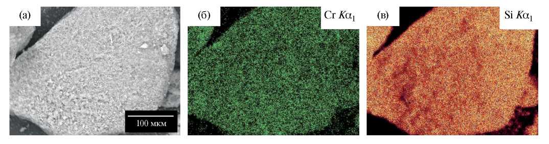 Рис. 5. Электронная микрофотография (а), карты по элементам для образца 5Cr/SiO2_toluene (б, в).