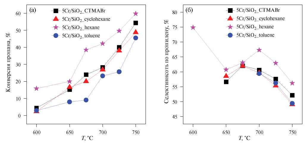 Для всех образцов с увеличением температуры наблюдается увеличение конверсии пропана и некоторое снижение селективности по пропилену. Следует отметить, что катализатор 5Cr/SiO2_hexane с наибольшим спектральным вкладом трехвалентного оксида хрома относительно шестивалентного демонстрирует максимальные значения селективности по пропилену и конверсии пропана во всем исследованном температурном интервале. Среди остальных образцом, наименьшую конверсию пропана и селективность по пропилену показал образец 5Cr/SiO2_toluene. Можно предположить, что причины такого поведения кроются в синтезе: толуол при прокаливании образца мог в большей степени вступить во взаимодействие с активными центрами хрома (подобно процессу коксообразования), и, возможно, именно поэтому для этого образца наблюдается настолько меньший спектральный вклад от трехвалентного хрома по сравнению с шестивалентным (в случае закоксовывания или, например, образования карбидов хрома спектральный вклад от трехвалентного оксида должен уменьшаться). Однако это всего лишь предположение, и доказательство или опровержение данной гипотезы требует дальнейшего исследования.