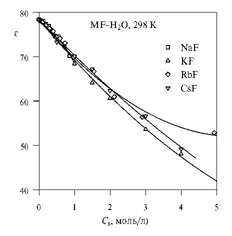 Диэлектрические свойства водных растворов NaF, KF, RbF и CsF изучались во многих работах [9–17]. Для использования в изучении взаимосвязи диэлектрических и термодинамических свойств пригодны публикации [12–17], обладающие необходимой полнотой данных. Непосредственно для проведения расчетов использовались данные работ [14, 16, 17], которые были аппроксимированы аналитическими выражениями, приведенными в табл. 1. Для диэлектрической проницаемости чистой воды использовано значение из [18].