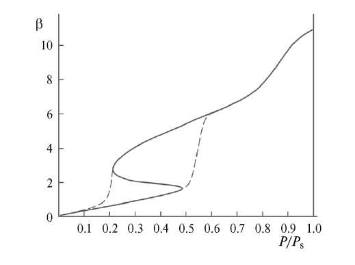 Рис. 3. Зависимость β(P/Ps) с гистерезисом.