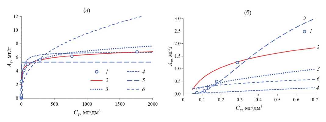 Рис. 1. Зависимости Ae от Ce для дозы сорбента 2 г: при изменении Ce до 2000 мг/дм3 (а); при изменении Ce до 0.7 мг/дм3 (б); 1 – эксперимент, изотермы: Темкина (2), Еловича (3), Ленгмюра (4), Дубинина–Радушкевича (5), Фрейндлиха (6).