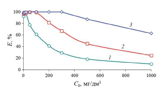 На рис. 10 приведена графическая зависимость эффективности извлечения ионов аммония E,%, от концентрации ионов аммония в исходном растворе C0, мг/дм3. Форма кривых идентична графическим зависимостям рис. 9, что объясняется пропорциональностью величин E и Kd, Ce и C0.