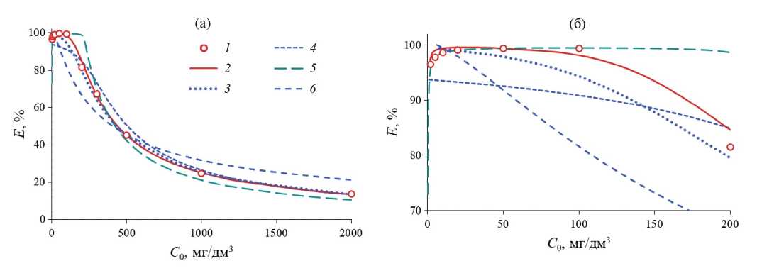 Рис. 3. Сравнение экспериментальных и расчетных значений эффективности извлечения фосфатов из раствора по моделям адсорбции для дозы сорбента 2 г: при изменении C0 до 2000 мг/дм3 (а); при изменении C0 до 200 мг/дм3 (б); 1 – эксперимент, изотермы: Темкина (2), Еловича (3), Ленгмюра (4), Дубинина–Радушкевича (5), Фрейндлиха (6).