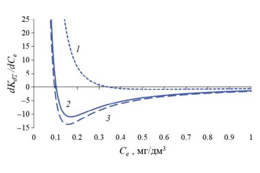 Обе графические зависимости показывают наличие корня функции (рис. 4 и рис. 5), при котором производная dKd/dCe равна 0. Обе функции меняют знак с плюса на минус, что подтверждает наличие максимума функций KdT = f(Ce), KdT = f(C0) и KdDR = f(Ce), KdDR = f(C0). В табл. 3 приведены корни функций уравнений (37) и (38).