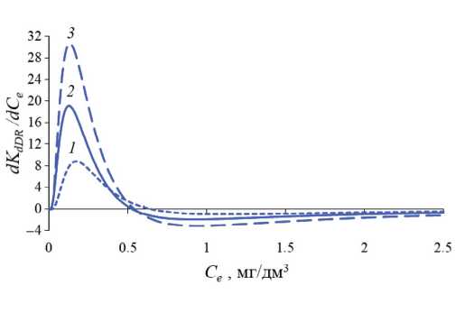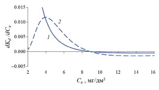 По уравнениям (37) и (38) на рис. 8 построены графические зависимости производных dKdT /dCe и dKdDR /dCe. Обе функции меняют знак с плюса на минус. Корень обеих функций оказался равным Ce = 9 мг/дм3, при котором функции имеют максимум в координатах Kd = f(Ce) (рис. 9).