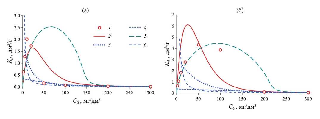 Рис. 6. Зависимости коэффициента распределения Kd от начальной концентрации фосфатов C0 в растворе для дозы сорбента:1 (а) и 2 г (б); 1– эксперимент, изотермы: Темкина (2), Еловича (3), Ленгмюра (4), Дубинина–Радушкевича (5), Фрейндлиха (6).