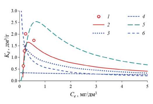 Исследованиям Kd при адсорбции посвящено большое количество работ [21–23] в основном в виде зависимости ln(Kd) = f(1/T), где T – температура процесса сорбции в K. В работе [21] Kd стронция и цезия определяли для системы песок – раствор. Результаты исследований сравнивали с Kd, являющимся параметром идентификации, найденным при обработке экспериментальных данных колоночной сорбции. В работе [23] для четырех значений температур (303, 313, 323, 333 К) исследован Kd для удаления 4-пиколина из сточной воды с использованием природной золы уноса при pH 6.22; C0 = 100 мг/дм3 и m = 4 г/дм3. Обзорная работа [22] охватывает результаты исследований, связанные с извлечением поллютантов геоматериалами (почвами и горными породами), где взаимодействие поллютантов с геоматериалами количественно оценено с помощью коэффициента распределения Kd. Помимо специфических свойств геоматериалов Kd зависит от значения рН порового раствора, температуры окружающей среды, типа и содержания веществ, присутствия микроорганизмов и т. д. В работе отмечено, что Kd варьируется в широких пределах, и методы, принятые для его определения, имеют свои ограничения и недостатки. Таким образом, исследователи критически оценивают эти методы, с тем чтобы они могли быть изменены или заменены новыми, которые могут быть легко внедрены для быстрого получения надежных результатов. С учетом вышеизложенного в своей работе авторы подчеркнули важность и роль параметров, влияющих на определение Kd.