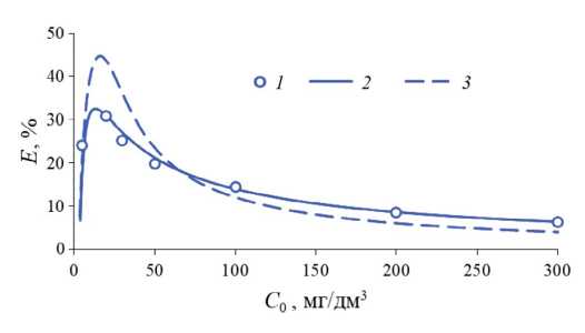 На рис. 3 приведено сравнение экспериментальных и расчетных значений E по моделям адсорбции при различных диапазонах изменения C0 для дозы сорбента 2 г.