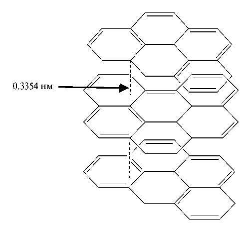 Физико-химические xapaктepистики углей пpивeдeны в тaбл. 1. Микрокристаллиты углерода представляют собой пакеты плоских слоев, образованных конденсированными гексагональными ароматическими кольцами атомов углерода (рис. 3). В этих слоях каждый атом углерода связан с соседними гибридизированной sp-связью, вследствие чего расстояние между ними равно 0.1415 нм. Слои гексагональных углеродных колец между собой связаны дисперсионными силами и расстояние между ближайшими слоями равно 0,3354 нм.