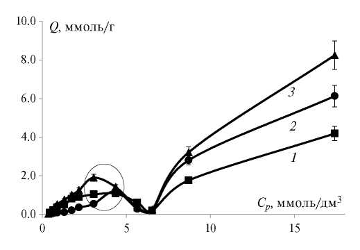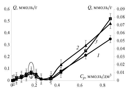 KF, (ммоль/г)·(л/ммоль)1/n | 0.020±0.003 | 0.051±0.004 | 0.034±0.002 |