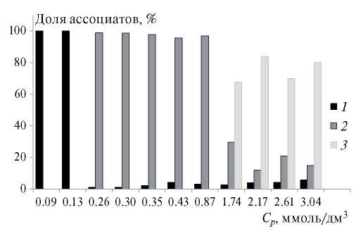 Рис. 6. Концентрационная зависимость гидродинамического радиуса в ассоциатах сапонина в водных растворах c гидродинамическим радиусом 1–10 (1), 15–150 (2), 160–250 нм (3).