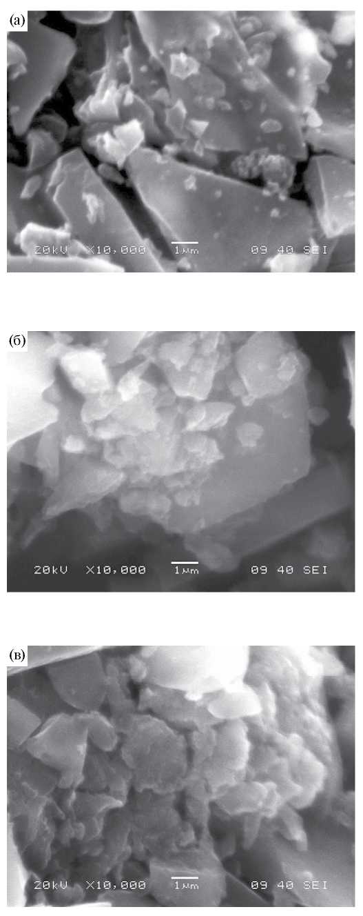 Как видно из рис. 7, при адсорбции сапонина с концентрацией ниже ККМ (рис. 7а) на поверхности активированного угля нет видимых изменений, из чего мы можем сделать вывод о заполнении сапонином объема пор сорбента. При увеличении концентрации сапонина до концентрации выше ККМ (рис. 7в) наблюдается процесс полимолекулярного заполнения поверхности углеродного материала, что также подтверждается выбором моделей для описания процесса адсорбции сапонина на поверхности угля.