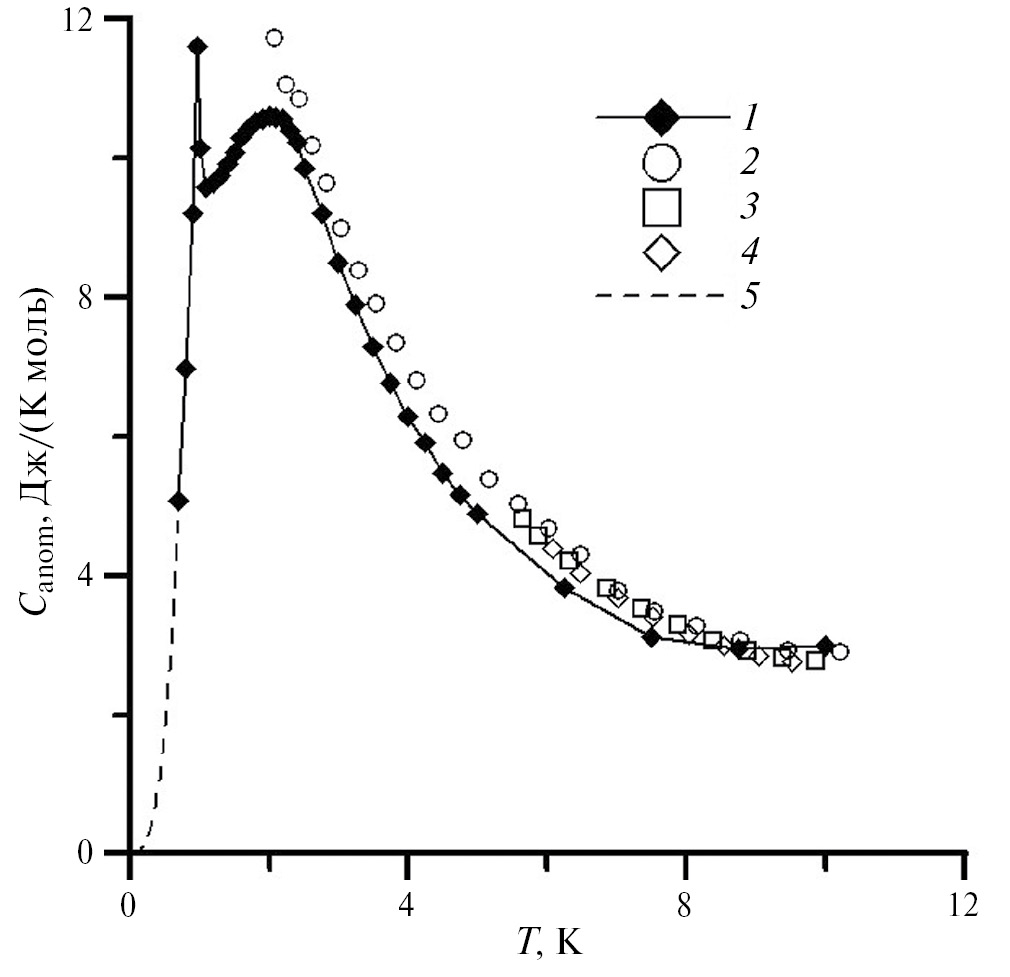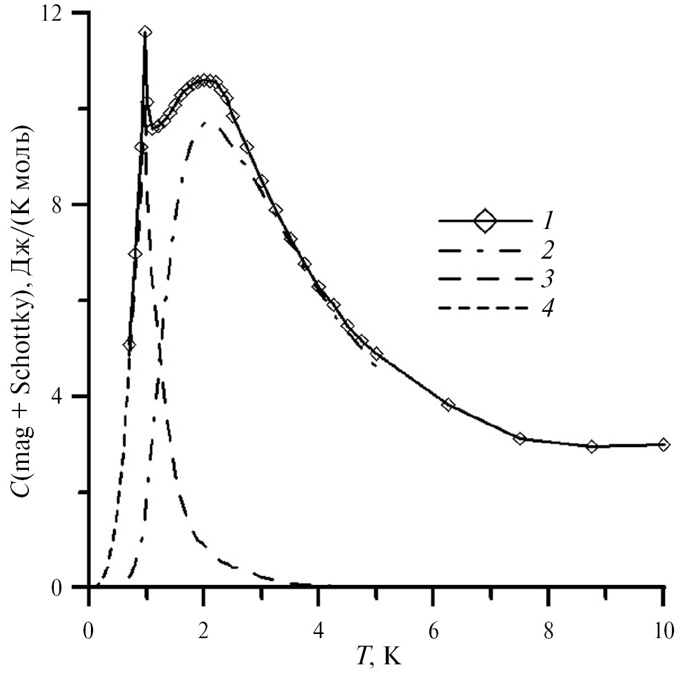Аномалия теплоемкости в области самых низких температур представлена как сумма магнитной аномалии и аномалии Шоттки, что позволило объяснить ход теплоемкости выше 20 K.