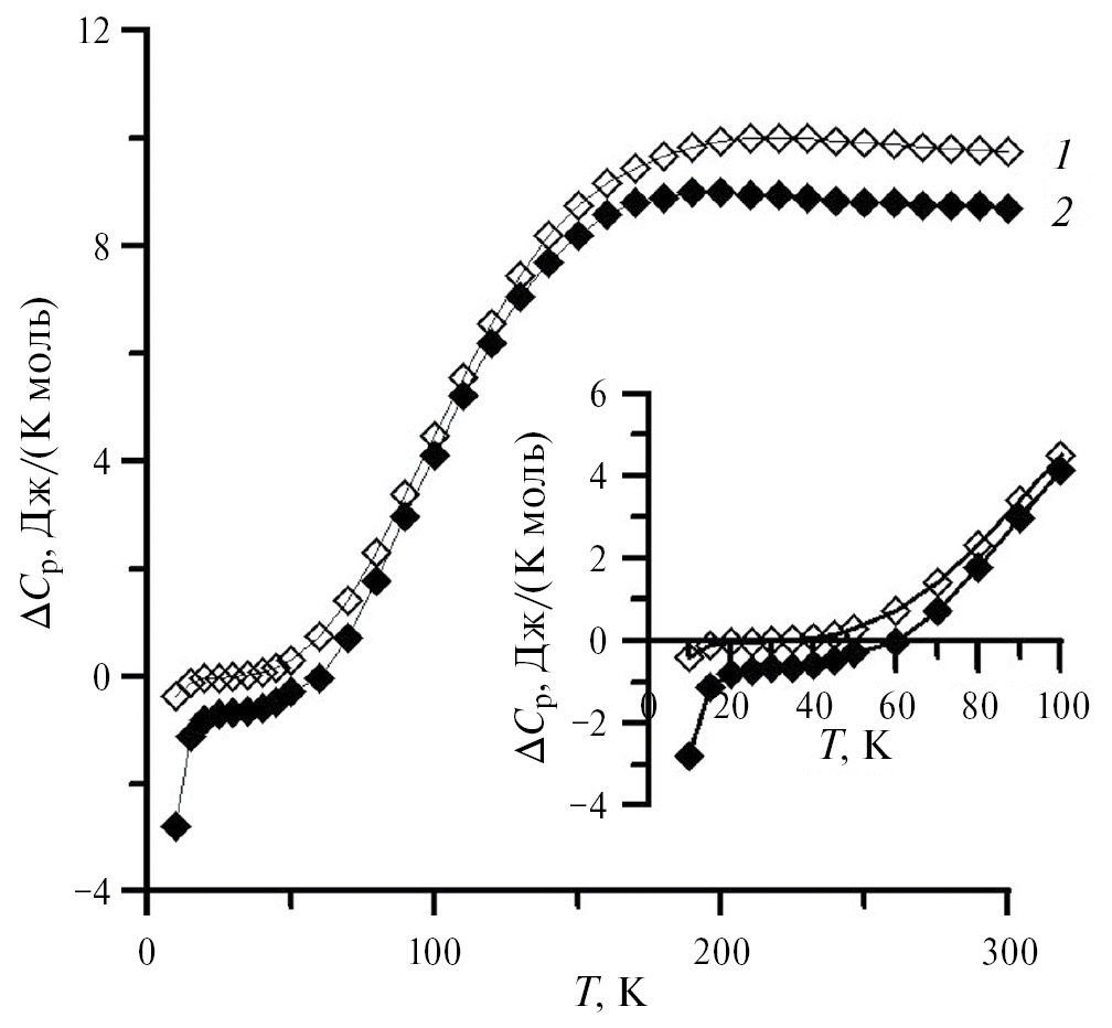 Рис. 5. Разность теплоемкости соединений европия и гадолиния: 1 – (Сp(Eu(OH)₃ – Сp(Gd(OH)₃; 2 – [Сp(Eu₂Ti₂O₇) – Сp(Gd₂Ti₂O₇)]/2.