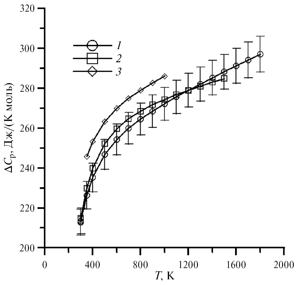 В области температур 315–1825 K измерения теплоемкости проводили в дифференциальном сканирующем калориметре DSC404 F1 Pegasus фирмы NETZSCH-Gerätebau GmbH. Для определения теплоемкости использовали метод отношений с изотермическими сегментами (DIN ISO 11357-4) в платинородиевых тиглях с крышкой в инертной атмосфере со скоростью нагревания 10 K/мин. Калибровка прибора выполнена по металлическим стандартам. Пределы допускаемых абсолютных погрешностей измерения температуры, удельной теплоты и удельной теплоемкости составляют до 3 K, до 3% и от 1 до 3.5% соответственно. Для проверки качества работы установки выполнили измерения теплоемкости корунда. Более детально методики измерений калориметрическими методами изложены в работе [21].