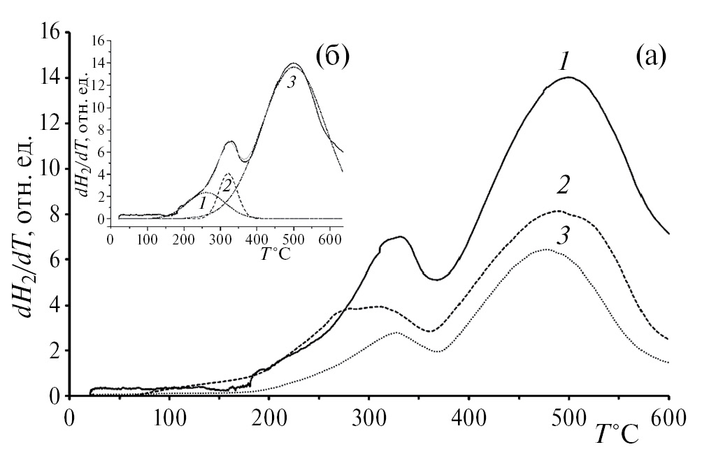 Рис. 1. Температурно-программируемое восстановление в газовой смеси 5%H₂/Ar и зависимости скорости поглощения водорода dH₂/dT от температуры Fe-содержащих катализаторов (а): 1 – Fe/S, 2 – Fe&1In/S и 3 – Fe&5In/S, аппроксимация экспериментального профиля Гауссовыми пиками на примере образца Fe/S (б).