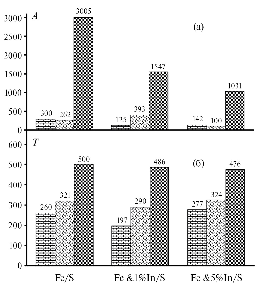 Рис. 2. Расчетные параметры Гауссовых составляющих в спектрах ТПВ в газовой смеси 5%H₂/Ar катализаторов Fe/S, Fe &1In/S и Fe&5 In/S: а – площади 1–3 пиков А в отн. ед., б – температуры максимумов 1–3 пиков Тmax в °C.