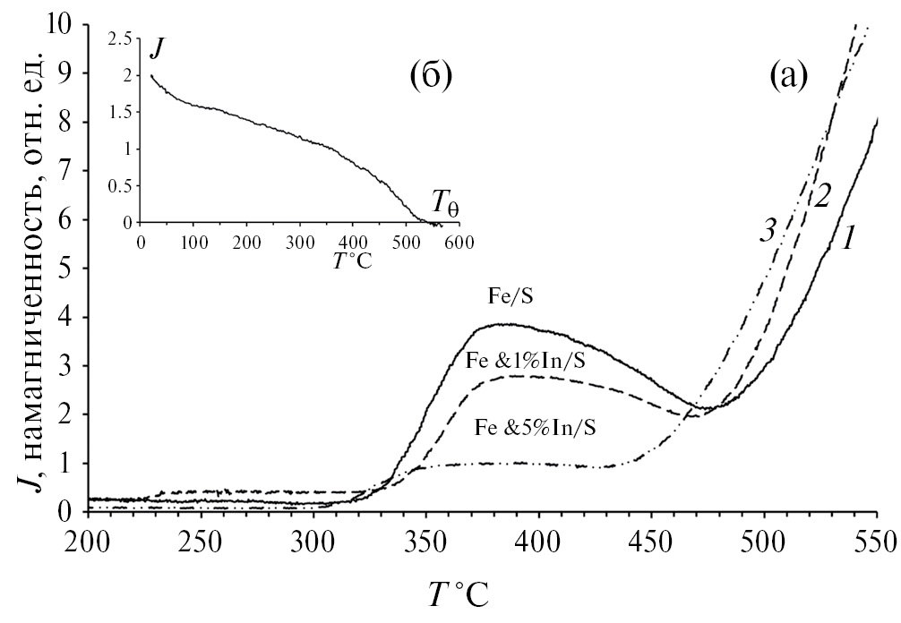 Интересно, что для образца Fe&5In/S участка падения намагниченности не наблюдается, т. е. в интервале температур 350–430°C наблюдается плато. Для того, чтобы подтвердить присутствие фазы магнетита Fe₃O₄ в интервале температур 350°C – 450°C, образец Fe&5In/S нагревали до 400°C в смеси 5%H₂/Ar, затем охлаждали до комнатной температуры и, заменив смесь на чистый Ar, снимали термомагнитную кривую (ТМК) с целью определения температуры Кюри ТQ магнетита. Из кривой на рис. 3б следует, что ТQ составляет 553°C. Известно, что размеры магнитоупорядоченных наночастиц магнетита (дисперсность) влияют на величину температуры Кюри Fe₃O₄, равную для массивного магнетита 572°C. При этом, чем меньше частицы по размеру, тем больше толщина поверхностного слоя, в котором имеются значительные нарушения регулярной структуры магнетита и тем меньше температура Кюри [20–22]. Измеренная температура Кюри позволяет нам сделать заключение о присутствии магнетита в образце в мелкодисперсной форме. Очевидно, что при постоянной концентрации магнетита должно было бы наблюдаться падение намагниченности при приближении к температуре Кюри. Поэтому мы полагаем, что в системе продолжается образование магнетита, которое компенсирует распад магнетита с формированием вюстита и падение намагниченности при приближении к температуре Кюри. Таким образом, по нашему мнению, присутствие 5мас. % In тормозит образование магнетита, что расширяет диапазон температур, в котором происходит накопление магнетита, в сторону высоких температур.