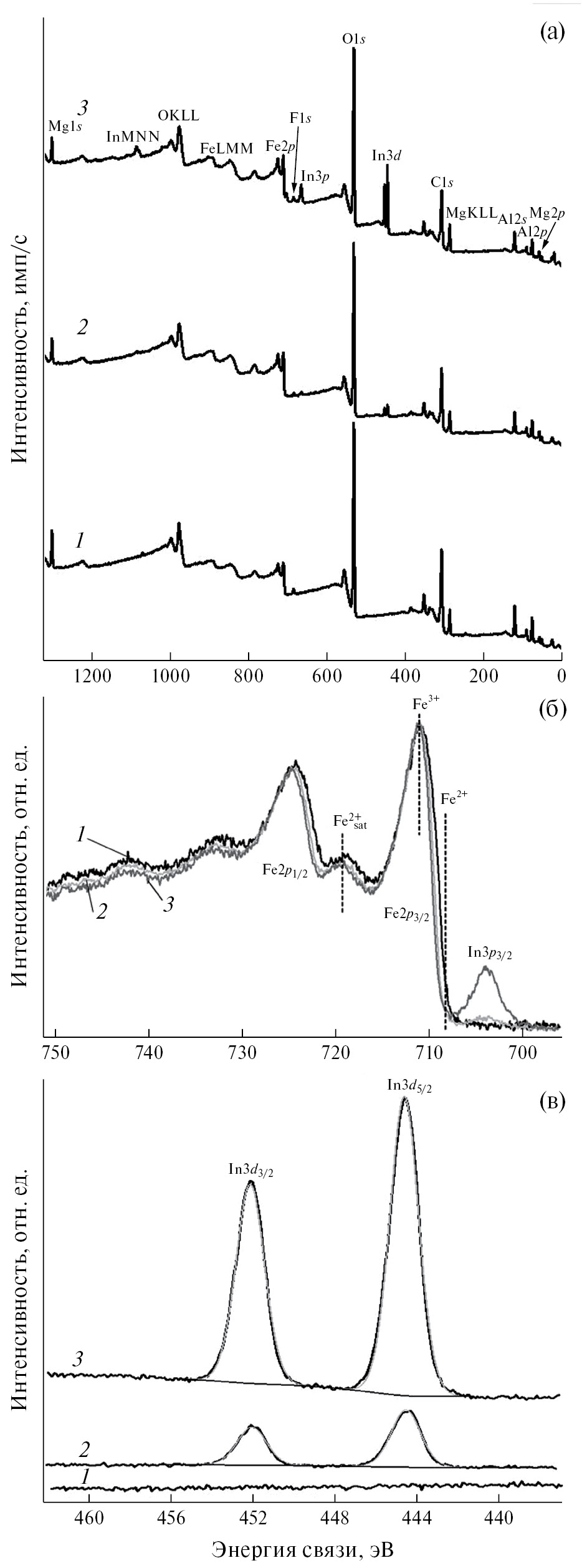 Рис. 5. Обзорные РФЭС-спектры (а), нормированные Fe₂p-РФЭС-спектры (б), In3d-РФЭС- спектры (в) образцов: 1 – Fe/S, 2 – Fe&1%In/S, 3 – Fe&5%In/S.