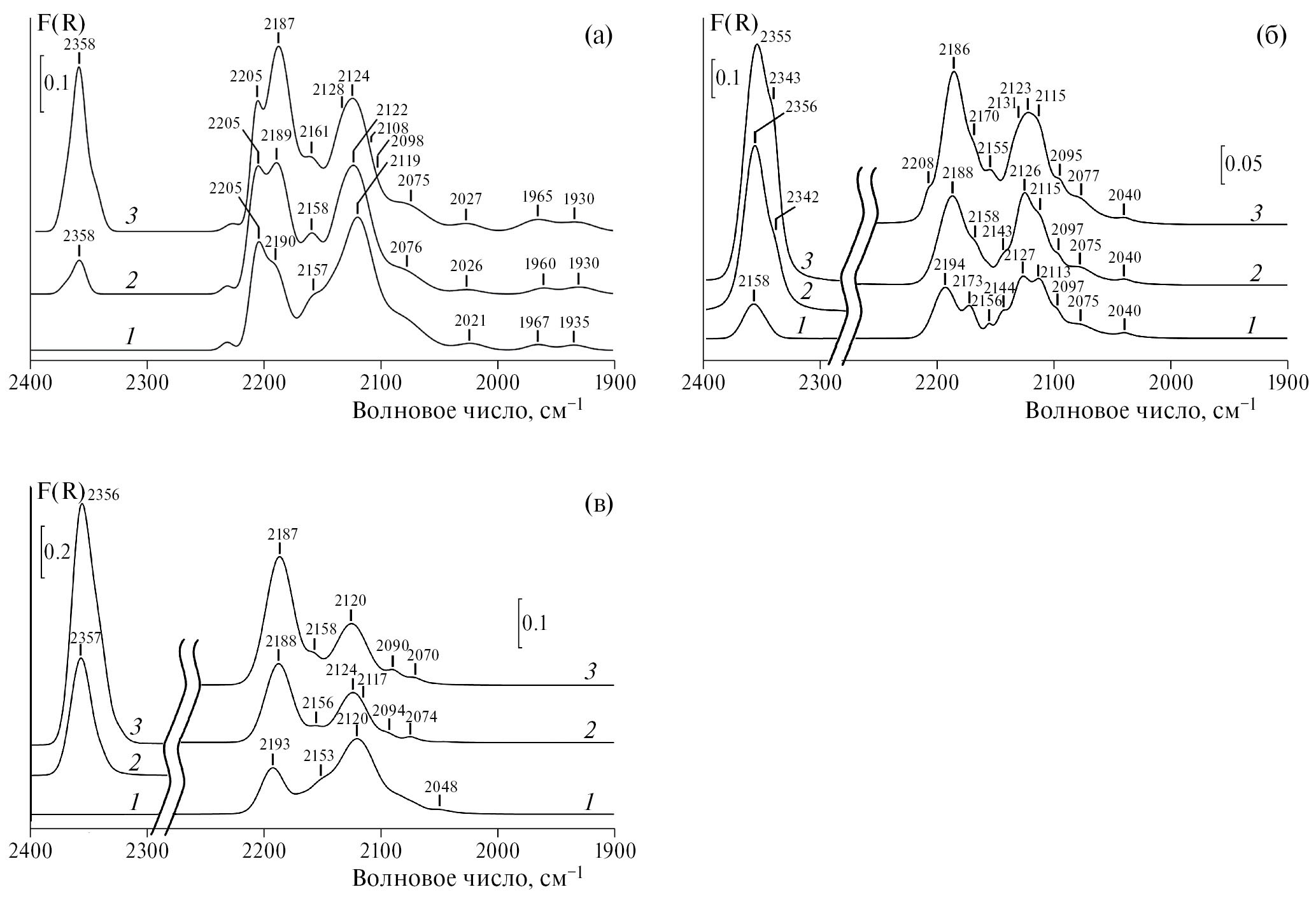Инфракрасные спектры диффузного отражения (ИК ДО) регистрировали на ИК-фурье-спектрометре EQUINOX 55/S (Bruker, Германия). Порошкообразную фракцию исследуемого образца помещали в кварцевую ампулу с окошком из CaF2 и прокаливали при температуре 400°С (1 ч на воздухе и 2 ч под вакуумом не ниже 5×10–5 Торр). Газообразный CO очищали перепусканием через ловушку с жидким азотом и длительно выдерживали над прокаленным цеолитом. Дифференциальные спектры адсорбированного CO получали вычитанием фонового спектра из экспериментального спектра образца, содержащего адсорбированный СО, с последующей коррекцией базовой линии в программе OPUS6.0 (Bruker). Для улучшения качества малоинтенсивных спектров осуществляли цифровое вычитание шума.