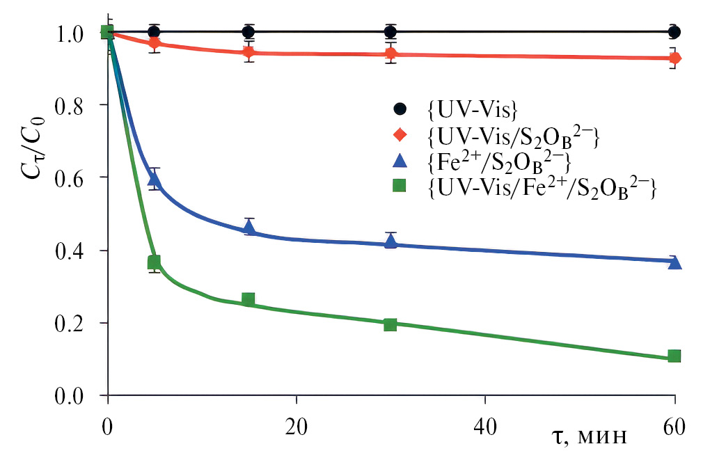 Полученные результаты свидетельствуют о реализации в процессе окислительной деструкции ЦЕФ в комбинированной системе {UV–Vis/Fe₂⁺/S₂O₈²⁻} мультирадикального механизма с участием гидроксильных радикалов, сульфатных и супероксидных анион-радикалов.