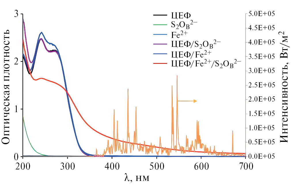 Рис. 2. Спектры излучения квазисолнечной лампы и поглощения водных растворов индивидуальных веществ и их смеси, [Fe₂⁺] = 0.1 мМ, [S₂O₈²⁻] = 1 мМ.
