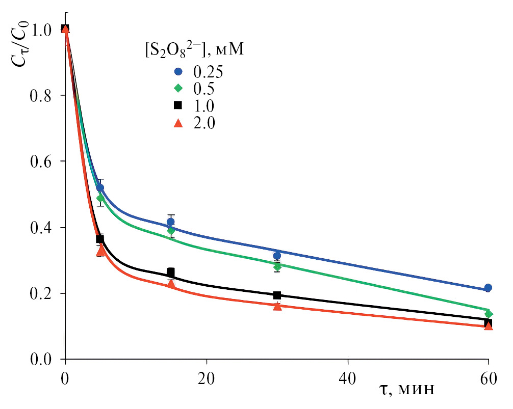 Существенное влияние на эффективность окисления органических соединений в фентон-подобной железо-персульфатной системе {Fe₂⁺/S₂O₈²⁻} оказывают концентрации Fe₂⁺и S₂O₈²⁻ и их соотношение. В ряде публикаций отмечалось, что максимальный выход активных форм кислорода (АФК) и оптимальные условия для окисления органических соединений реализуются при соотношении [S₂O₈²⁻]:[Fe₂⁺]=1:1 [24–27].