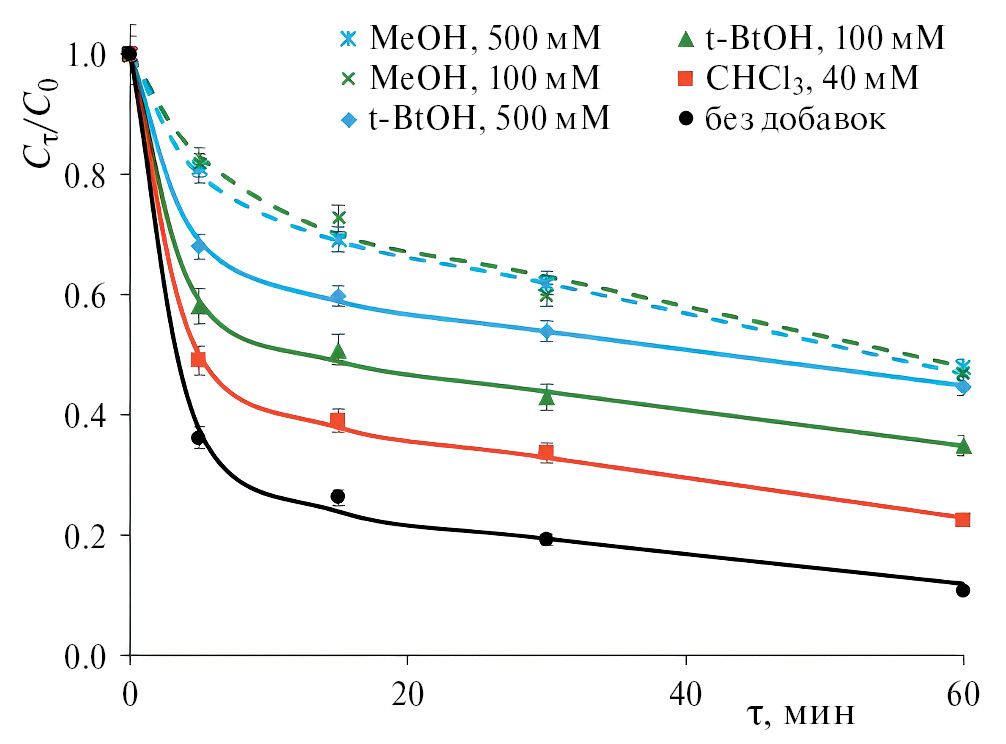 В качестве “ловушки” супероксидного анион-радикала в фентоновских и фентон-подобных системах широко используют трихлорметан [30, 36, 37], так как константа скорости его взаимодействия с O₂•⁻на четыре порядка выше чем с HO• радикалами (kCHCl₃/O₂•– = 3×1010 М–1с–1, kCHCl₃/•OH = 5×106 М–1с–1 [37]). Установлено, что в присутствии трихлорметана скорость реакции окисления ЦЕФ в системе {UV–Vis/Fe₂⁺/S₂O₈²⁻} снижается, что приводит к уменьшению эффективности процесса на 12% (рис. 5).
