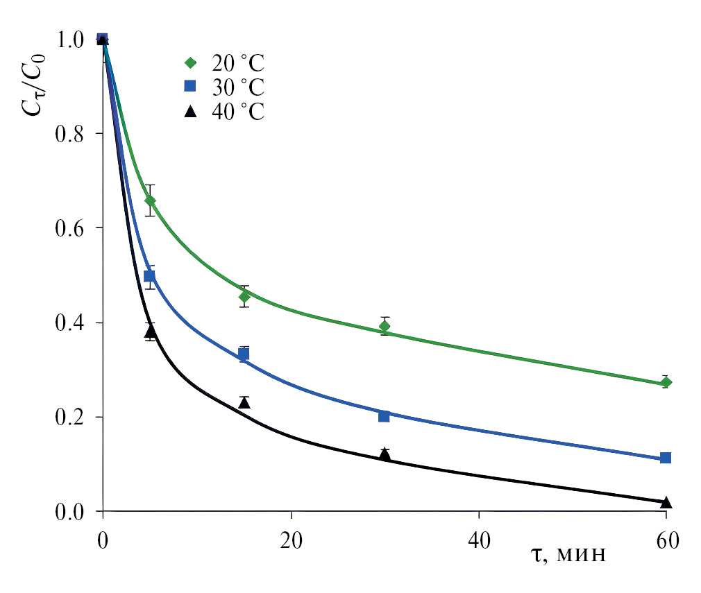 Экспериментально установлено, что с увеличением температуры с 20°C до 40°C начальная скорость реакции окисления ЦЕФ увеличилась в 1.7 раза (с 2.52 мкМ/мин до 4.23 мкМ/мин), эффективность конверсии – с 73% до 98% (рис. 6). Кажущаяся энергия активации, рассчитанная методом начальных скоростей, составила 45 кДж∙моль–1, что сопоставимо со значениями, полученными для антибиотиков цефалоспоринового ряда [38, 39].