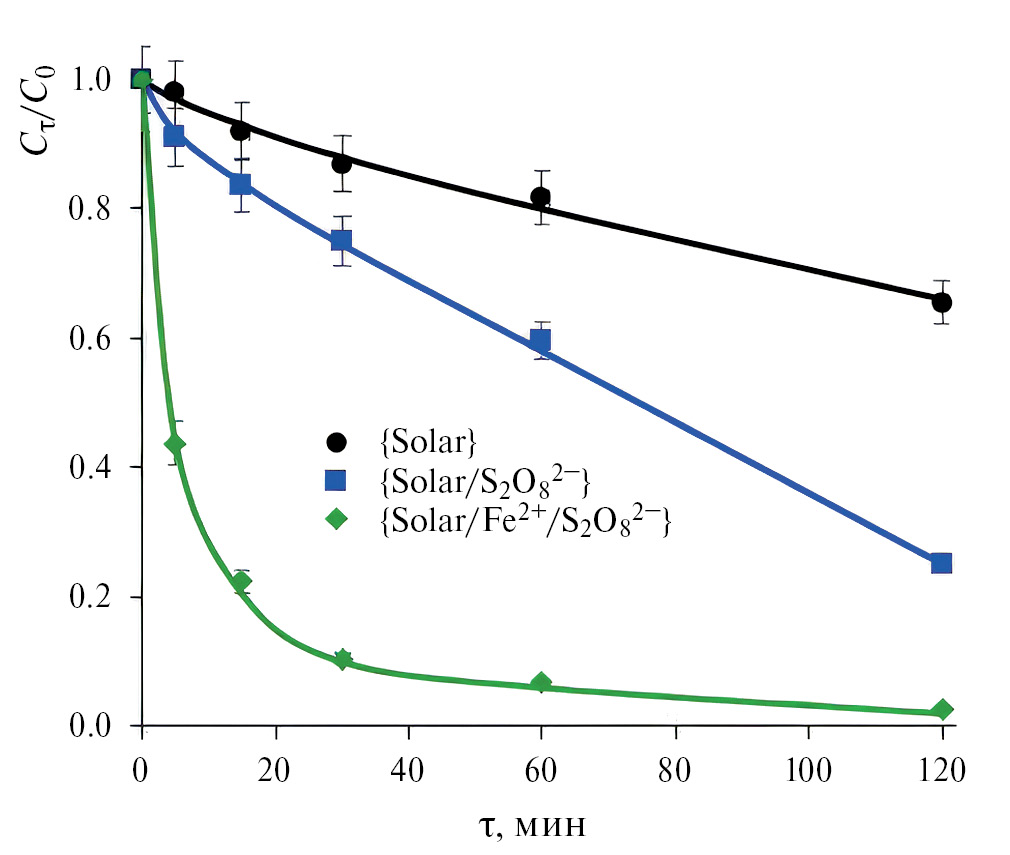 Результаты по окислительной деструкции цефтриаксона в системе {UV–Vis/Fe₂⁺/S₂O₈²⁻}, с использованием в качестве источника излучения ксеноновой лампы с квазисолнечным спектром, хорошо согласуются с результатами натурных исследований (“open-air”) при воздействии естественного солнечного излучения {Solar/Fe₂⁺/S₂O₈²⁻}. Экспериментально установлено, что ЦЕФ на солнечном свету разлагается медленно, за 120 мин экспозиции его концентрация в растворе снизилась на 35% (рис. 7). При добавлении персульфата, в системе {Solar/S₂O₈²⁻}, реализуется процесс окислительной деструкции ЦЕФ, начальная скорость реакции возрастает с 0.3 мкМ/мин до 0.8 мкМ/мин, эффективность удаления целевого соединения увеличивается с 35 до 75% при 120 мин экспозиции. В системе {Solar/Fe₂⁺/S₂O₈²⁻} наблюдается существенное увеличение начальной скорости реакции окисления ЦЕФ (в 5.5 раз), и уже через 30 мин экспозиции достигается 90%-ная конверсия ЦЕФ, а через 120 мин – 98%-ная. Существенная интенсификация процесса окисления ЦЕФ в системе {Solar/Fe₂⁺/S₂O₈²⁻} обусловлена повышением ее общего окислительного потенциала при комбинированной активации персульфата ионами железа, УФ-С (<300 нм) составляющей естественного солнечного излучения и термическим воздействием.