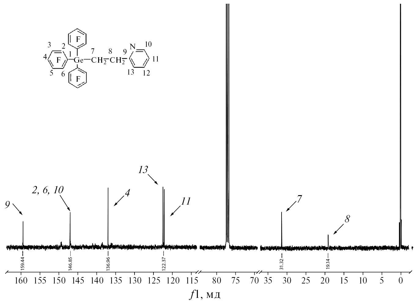 Рис. 2. (¹³С) ЯМР-спектр трис(пентафторфенил)-2-пиридилэтилгермана.