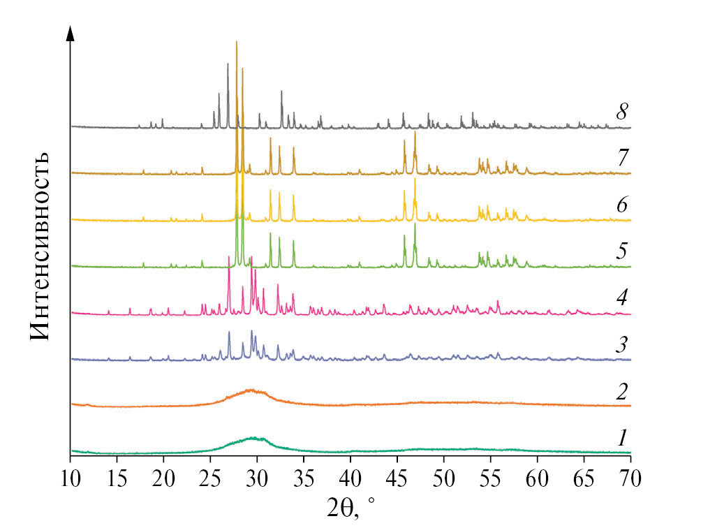 Рис. 1. Дифрактограммы керамик Nd₂WO₆, полученных отжигом м/а смеси оксидов Nd₂O₃+WO₃ (1) 440°C, 6 ч, (2) 600°C, 4 ч, (3) 700°C, 4 ч, (4) 900°C, 4 ч, (5) 1200°C, 4 ч, (6) 1400°C, 4 ч, (7) 1500°C, 1 ч, (8) 1600°C, 1 ч.