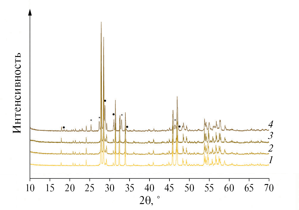 Рис. 4. Дифрактограммы моноклинных твердых растворов (Nd₁₋ₓCaₓ)₂WO₆, х = 0(1), 0.01(2), 0.025(3), 0.1(4). Символами обозначены пики примесных фаз * – CaCO₃, • – CaWO₄.