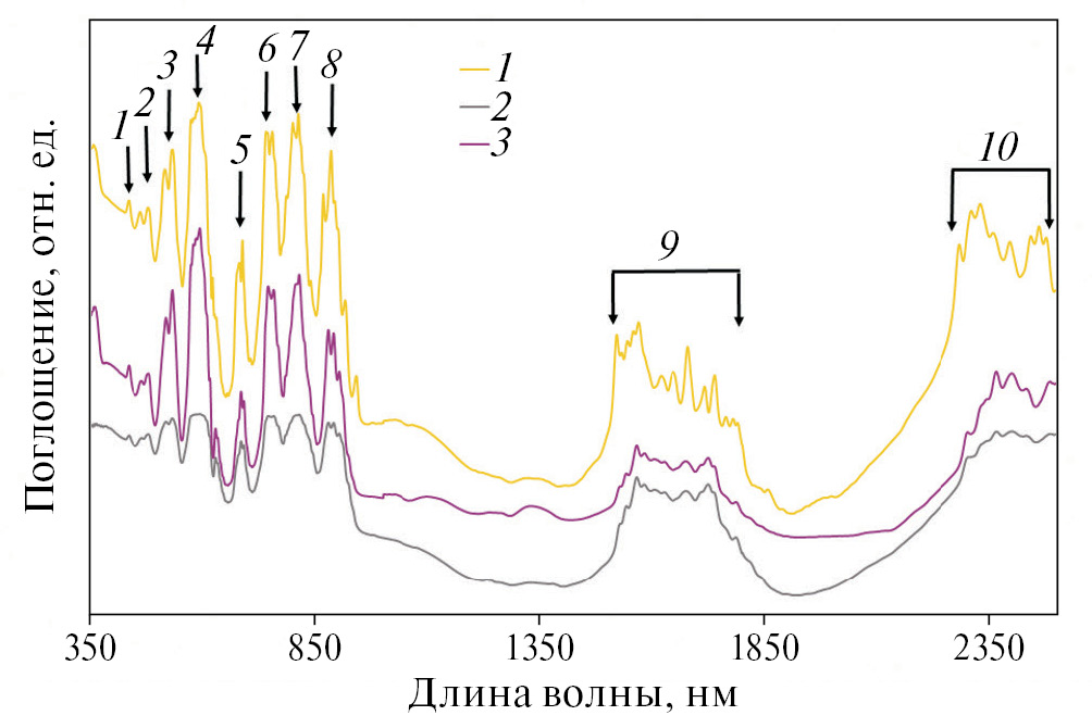 Спектры поглощения материалов рассчитывали по их спектрам диффузного отражения, измеренным на спектрофотометре TerraSpec 4 Hi-Res (Malvern Panalytical, Великобритания) в диапазоне длин волн от 350 до 2500 нм (от 28 000 до 4 000 см⁻¹) при спектральном разрешении 3 нм. В диапазоне от 350 до 1000 нм и 6 нм в остальной части спектра. Функцию отклика спектрофотометра учитывали через регулярные промежутки времени с использованием сертифицированного в Labsphere (Labsphere, Inc., США) стандарта отражения из Spectralon. Полосы поглощения аппроксимировали набором гауссиан с использованием Origin версии 8 (OriginLab Corp., США).