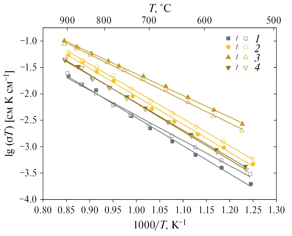 Рис. 6. Аррениусовские зависимости общей проводимости δ-Nd₂WO₆ (1) и моноклинных твердых растворов (Nd₁₋xCax)₂WO₆–δ, х = 0 (2), 0.01 (3), 0.025 (4). Полыми значками отмечены значения проводимости во влажном воздухе.