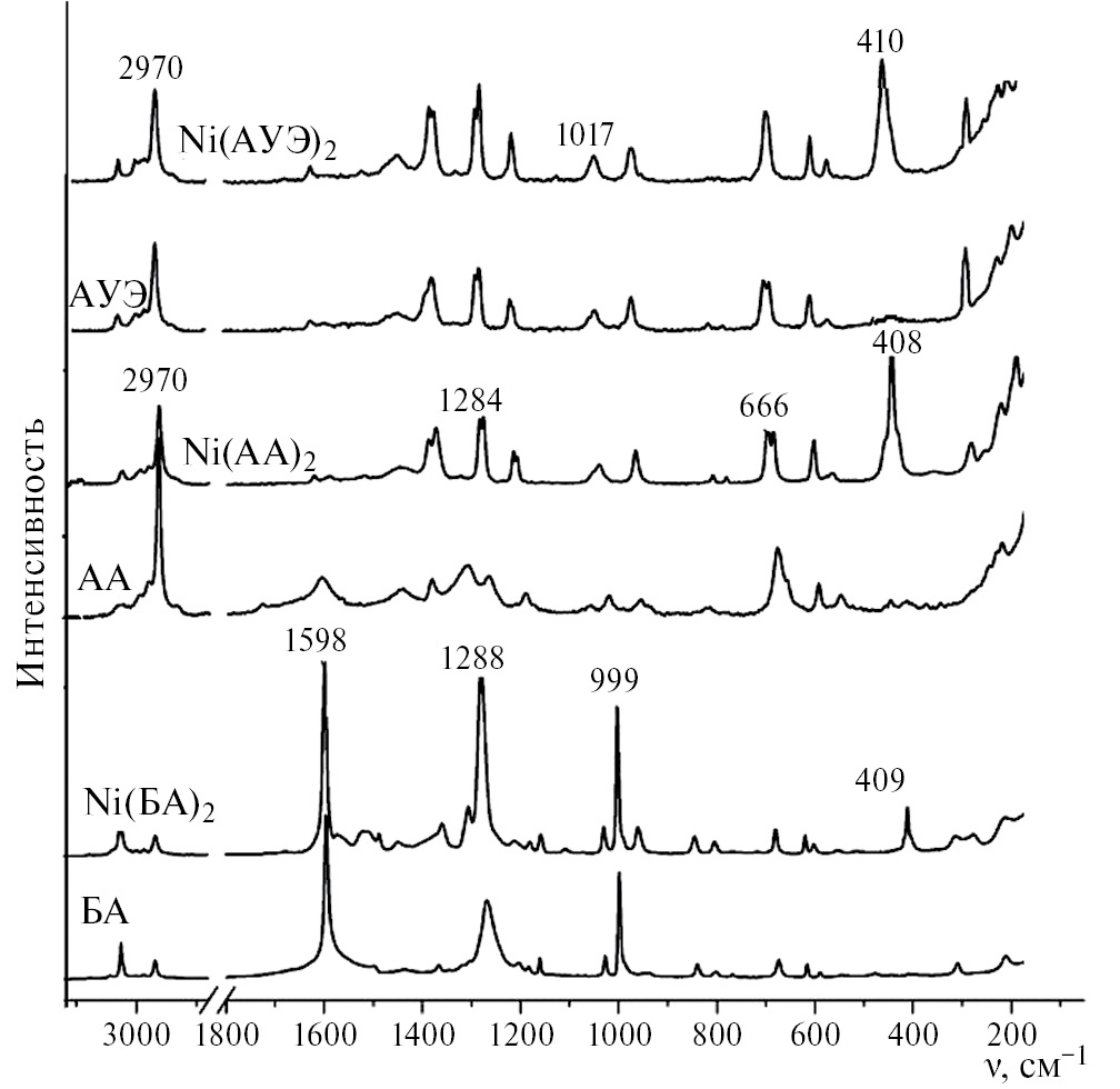 В области 1700–1000 см⁻¹ (рис. 3) проявляются валентные симметричные и ассиметричные колебания основных функциональных групп ацетилацетона, бензоилацетона и ацетоуксусного эфира: ν(С–О), ν(С=О), ν(С–С), ν(С=С), валентные ν(С–С), ν(С–Н) колебания фенильной группы бензоилацетона и деформационные колебания δ(С–Н) хелатного кольца комплексов. Карбонильная группа сопряженной системы νа(С=С–С=О) характеризуется в ИК-спектре колебаниями, зарегистрированными при 1598–1551 см⁻¹. Полосы поглощения в области 1515–1510 см⁻¹ соответствуют валентным колебаниям ν(О–С=С–С) β-дикарбонильного лиганда в енольной форме, координированного ионом никеля.