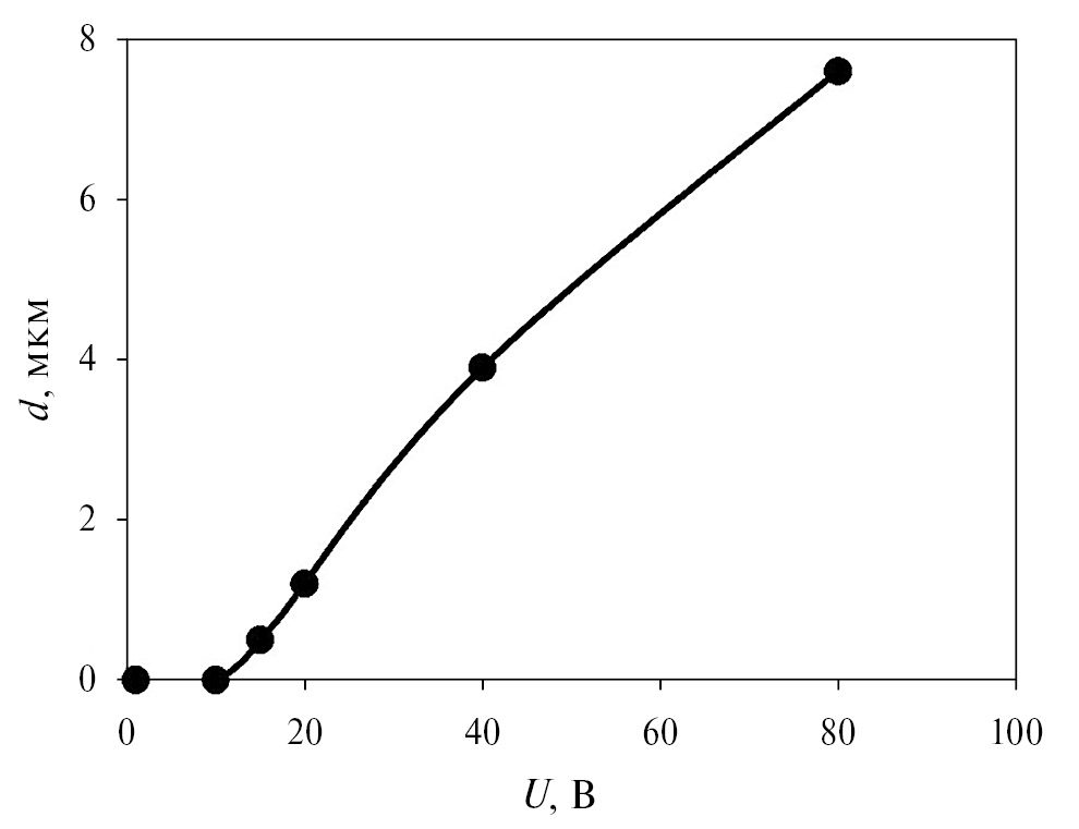 Рис. 3. Зависимость толщины покрытия (d) от напряжения (U) при ЭФО из суспензии 10 г/л SDC без добавления йода (время осаждения 1 мин).